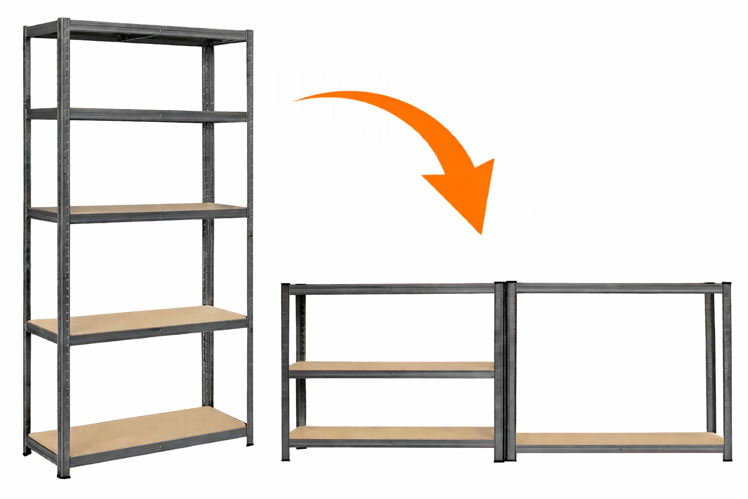 ➡️ Regał wyposażony jest w pięć przestronnych półek, których wysokość można dowolnie regulować. Dzięki temu łatwo dopasujesz układ przestrzeni do przechowywanych przedmiotów – niezależnie, czy są to mniejsze narzędzia, czy większe gabaryty.