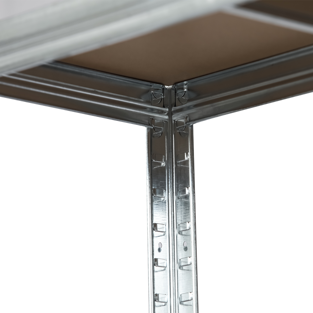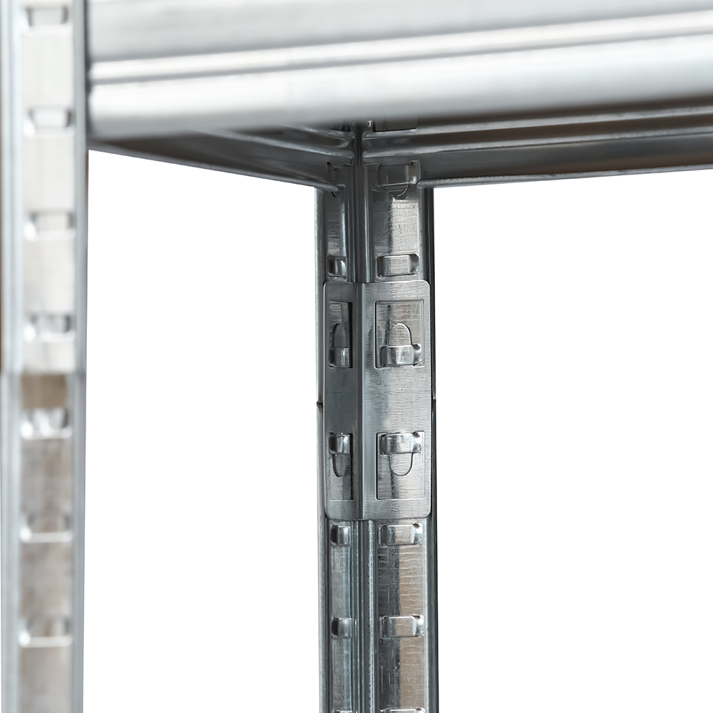 - Regał jest wykonany ze stali ocynkowanej, która skutecznie chroni stalowe elementy przed korozją. Gładkie, starannie wykończone krawędzie minimalizują ryzyko zadrapań i skaleczeń podczas użytkowania czy montażu.