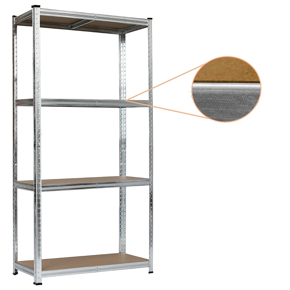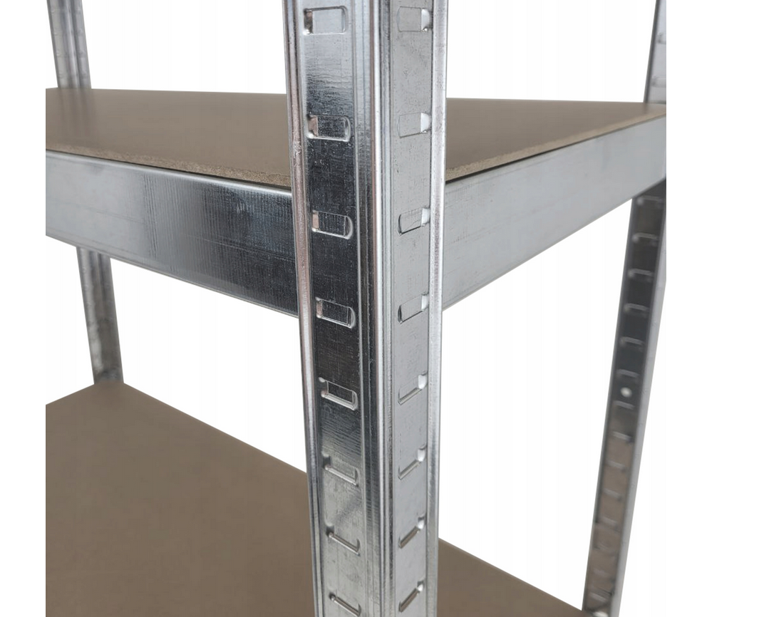 - Regał jest wykonany ze stali ocynkowanej, która skutecznie chroni stalowe elementy przed korozją. Gładkie, starannie wykończone krawędzie minimalizują ryzyko zadrapań i skaleczeń podczas użytkowania czy montażu.